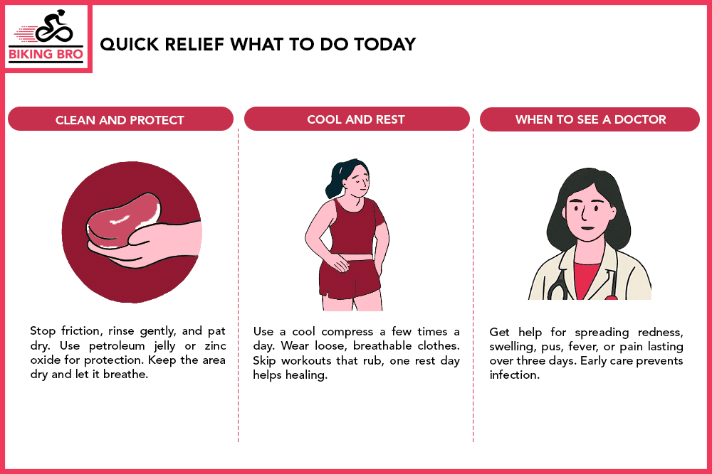 Stop the friction right now. Skip riding or any workout that rubs the area. Rinse with lukewarm water, pat dry, and give the skin air time. Use a thin barrier like zinc oxide on chafed spots.